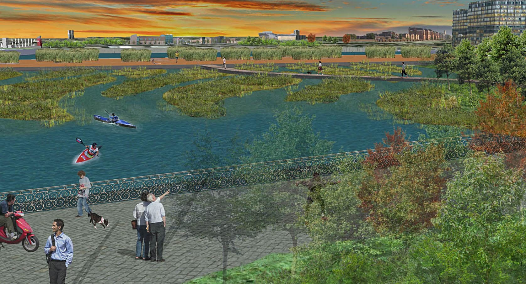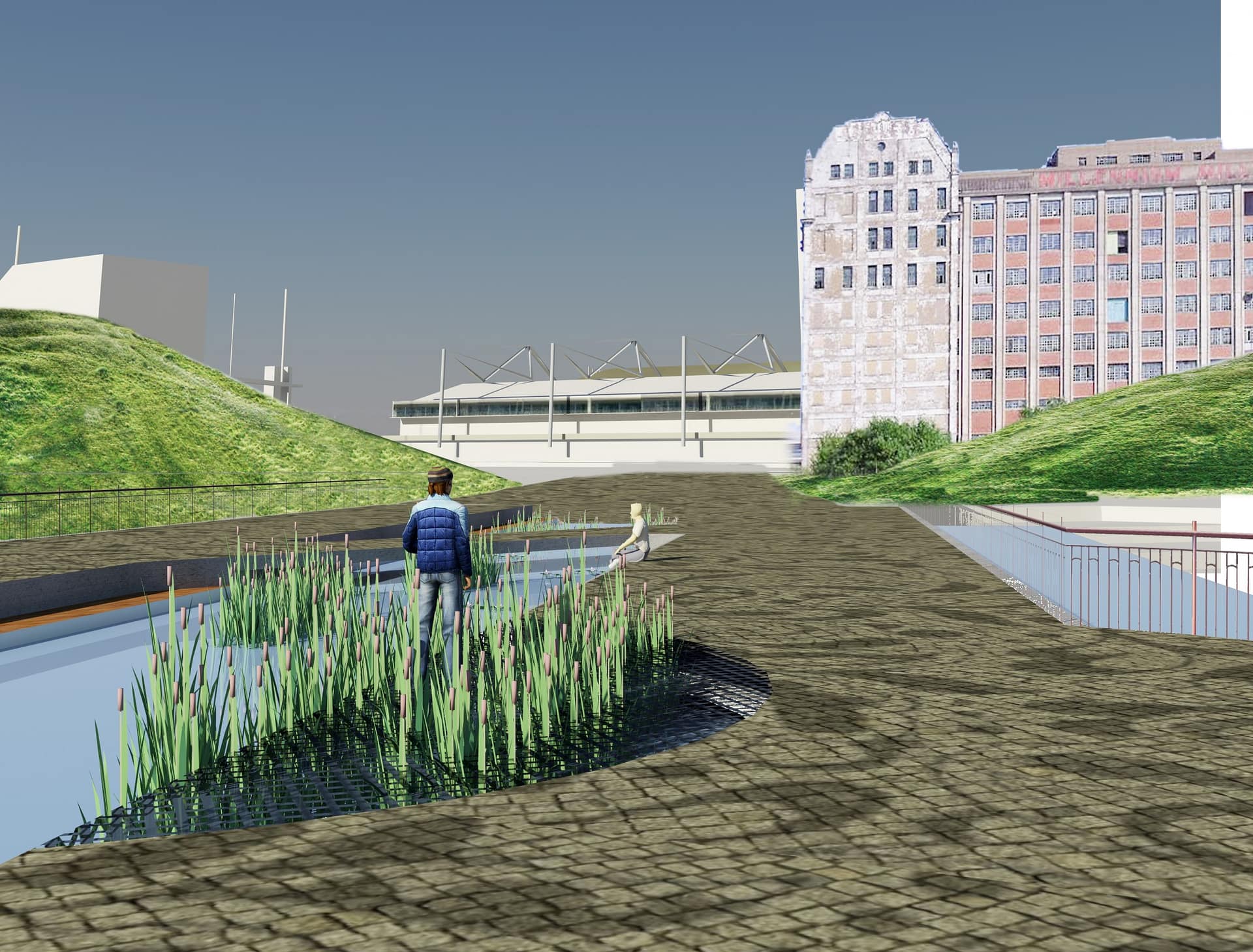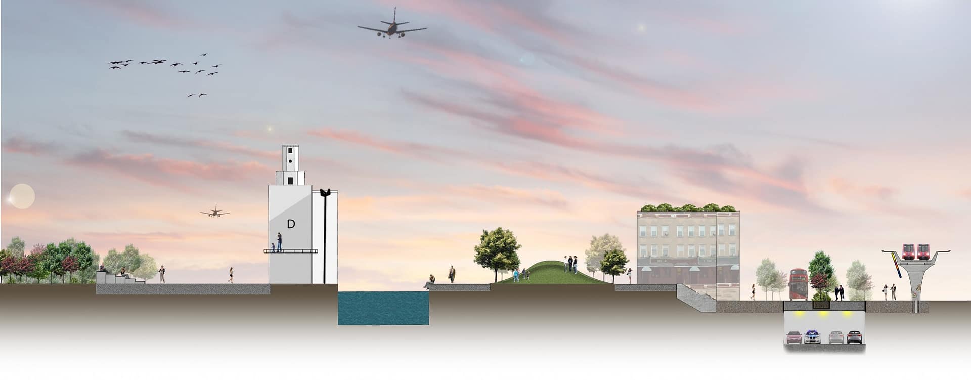 The main intervention includes the creation of two, interconnected wetland forest parks on the eastern and western parts of the site featuring a river delta inspired wetland. The wetlands will act as sustainable urban drainage and filtration system for runoff. It will not only give a boost to the local ecosystems but also become a retreat for local communities and a visitor attraction.