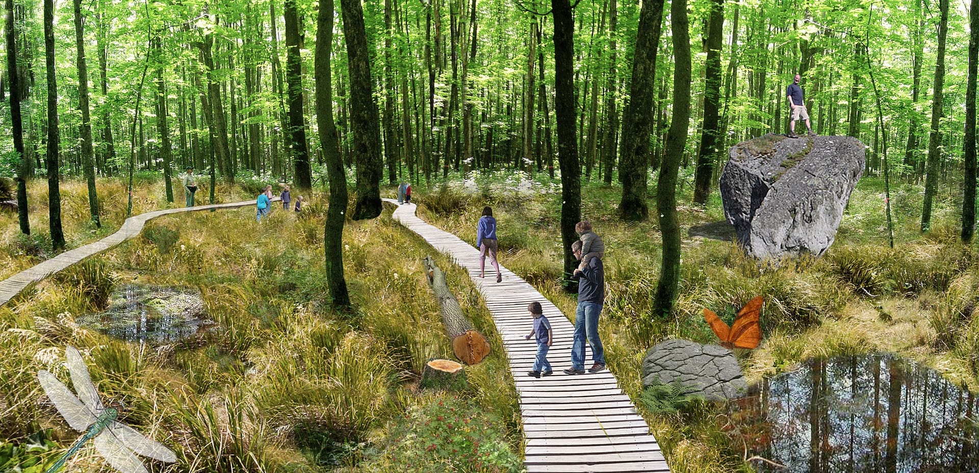 By creating interconnected pockets of forests and wetlands as well as large pedestrian corridors the design improves accessibility for people and nature, creates an interesting place to visit, consolidates the local identity and strengthens the local communities.